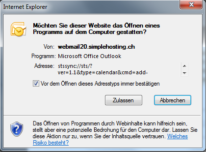 4. Es wird nun direkt ihr Outlook geöffnet mit der Frage ob sie diese Intergration zulassen möchten. Bestätigen sie dies mit Zulassen.