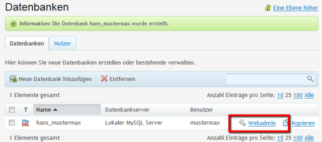 4. Sobald der Datenbank-Benutzer für die Datenbank erstellt worden ist, kann über das Menü Webadmin auf die Datenbank via DB Webadmin zugegriffen werden ( nur bei MySQL ). Sollten sie es bevorzugen auf die DB remote zuzugreifen ( ein Muss bei MSSQL ) können wir ihre IP Adresse auf unserer Firewall dafürt freischalten. Eröffnen sie dazu ein Ticket unter https://my.simplehosting.ch/submitticket.php?step=2&deptid=1 und geben sie ihre öffnentliche IP Adresse ( www.heise.de/ip  ) an.