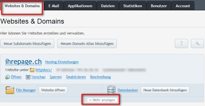 Navigieren Sie zu "Websites & Domains" und kilcken dann auf "mehr anzeigen" um alle Hosting Funktionen anzuzeigen.