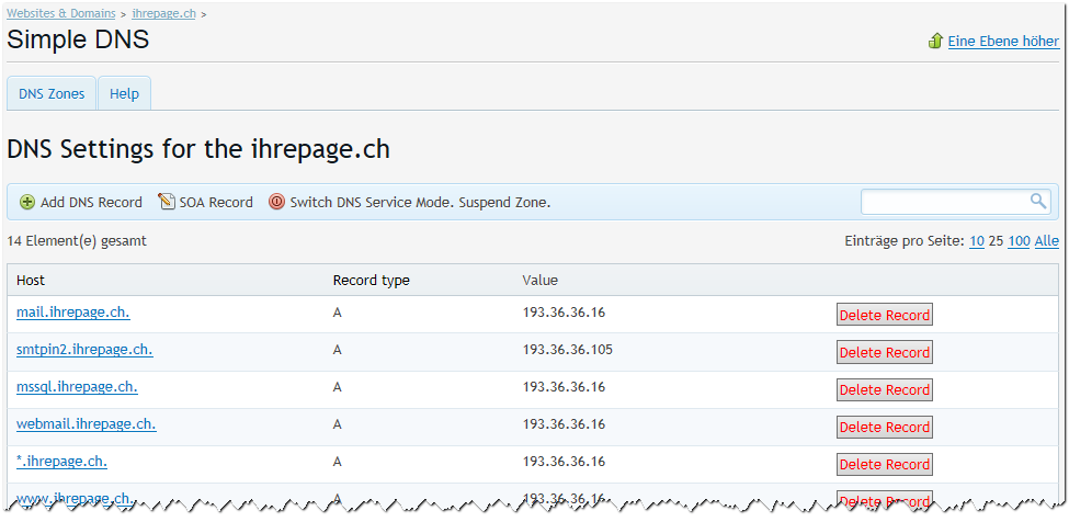 • Einen DNS Eintrag löschen mit dem Klick auf "Delete Record". Achtung: DNS Eintrag wird sofort gelöscht ohne nachzufragen