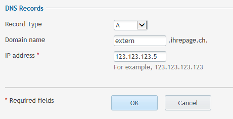Klicken sie auf "Add DNS Record", wählen den Record Typ "A" aus, geben dann alle benötigten Angaben ein und speichern dies mit "OK" ab.