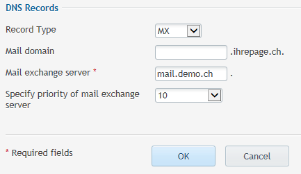 Klicken sie auf "Add DNS Record", wählen den Record Typ "MX" aus, geben dann alle benötigten Angaben ein und speichern dies mit "OK" ab.