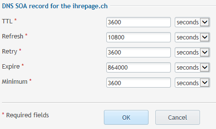 Klicken sie auf "SOA Record" um die Zeiteinstellung für die entsprechende Domain vorzunehmen und speichern dies mit "OK" ab.