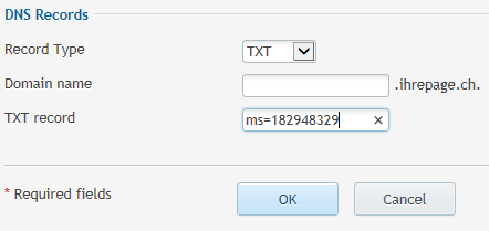 Klicken sie auf "Add DNS Record", wählen den Record Typ "TXT" aus, geben dann alle benötigten Angaben dazu ein und speichern dies mit "OK" ab.