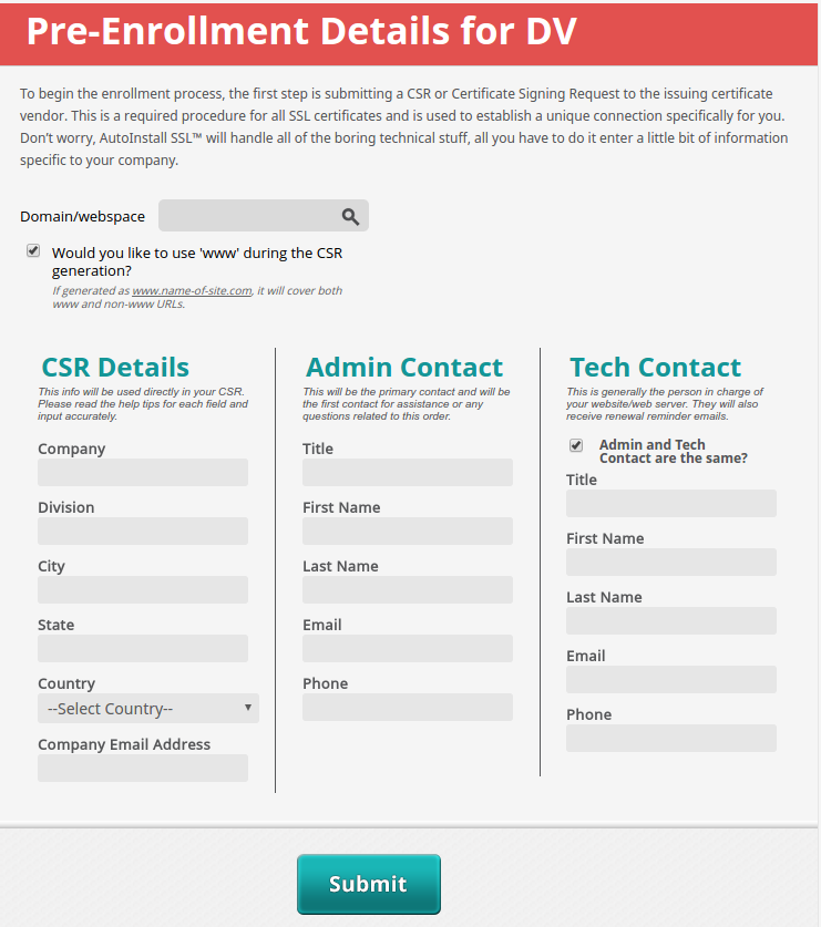 B. Als Hosting Kunde bei uns haben wir ihnen das einrichten von ihrem SSL Zertifikat so einfach wie möglich gestaltet mit dem AutoInstall SSL Plugin. Sie müssen sich bei einem normal Domain validated Zertifikat lediglich im Hosting Control Panel anmelden, Ihre Details und die Details vom zu schützendem Domain Namen oder Subdomain Namen angeben und der Rest macht das System komplett selbsständig. Hier die die Schritte dazu: