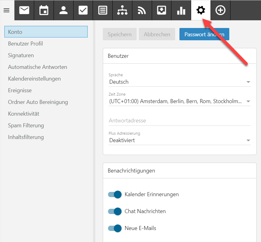 2. Nach dem Login öffnen sie den Menüpunkt "Einstellungen" oben unter dem Zahnrad.