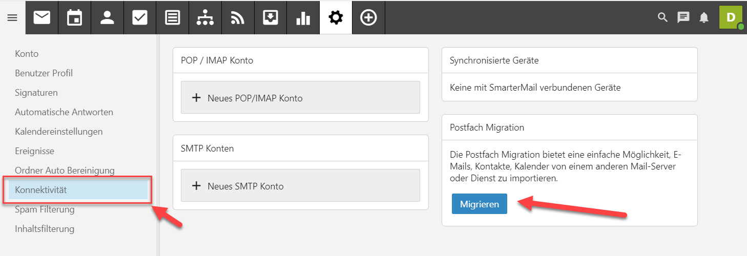 3. Wählen sie nun den Menüpunkt "Konnektivität " und danach den Button "Migrieren".