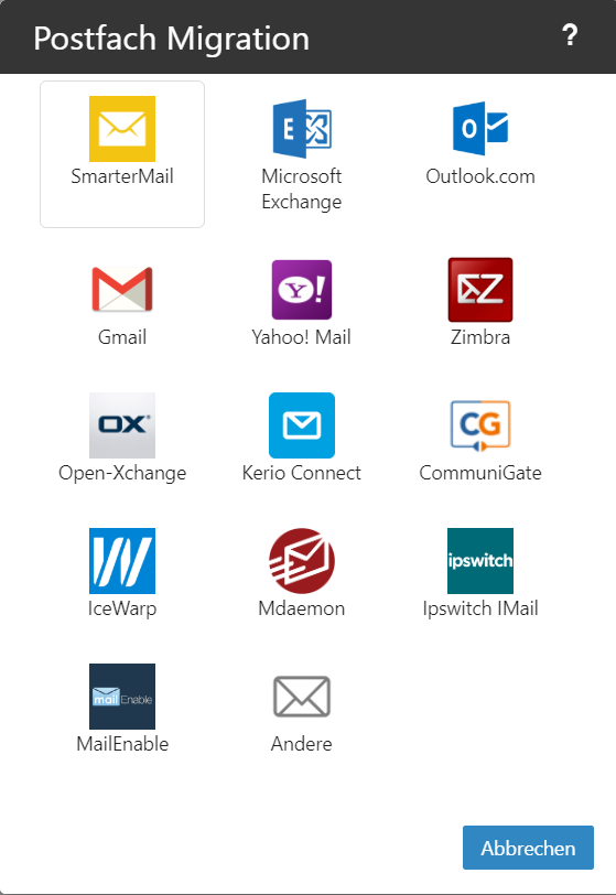 3. Nun wählen sie ihren bestehenden Provider aus der Liste aus oder wählen den Punkt "Andere" falls der bestehende Mail Provider nicht in der Liste vorkommt.