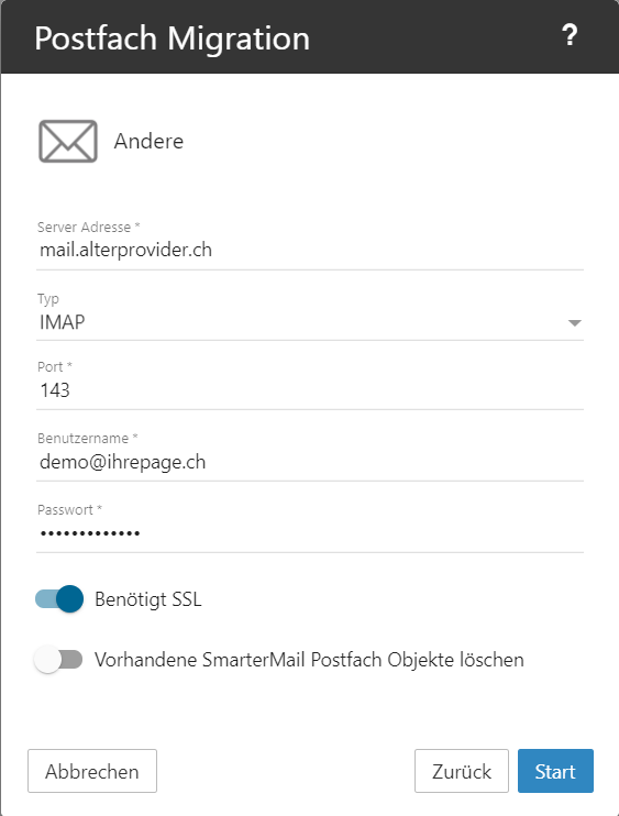 5. Nun starten sie den Import via "Start". Dies kann je nach Mailbox Grösse nun einige Zeit 5min - 4h dauern.